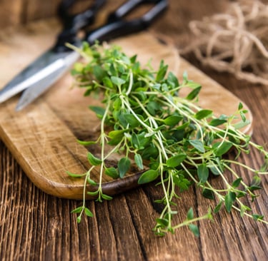 O tomilho é um pequeno arbusto aromático da família Lamiaceae e é conhecido por seu sabor picante e por ser um aliado da saúde. Ele é rico em óleos essenciais como o timol e o carvacrol, que são potentes compostos com ações antibacterianas, antifúngicas, anti-inflamatórias e antioxidantes.