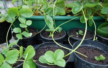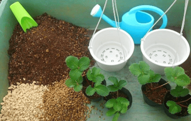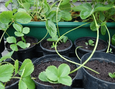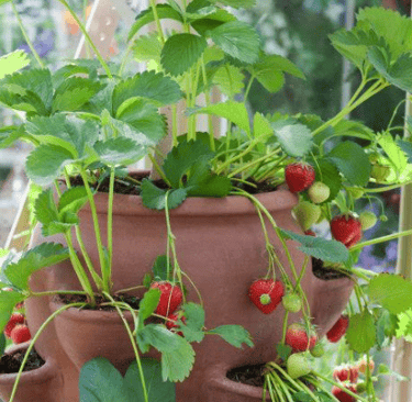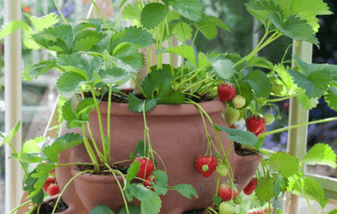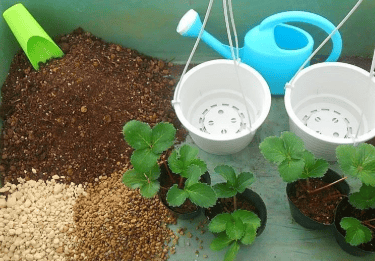 Os pés de morango podem ser plantados em vasos, jardineiras, cestas suspensas ou outros tipos de vasos. Em vasos grandes ou jardineiras, é possível plantar mais de uma muda e aumentar a produção de frutos por vaso. Antes do plantio dos morangos, deve-se fazer a drenagem dos vasos com pedriscos, seixos, argila expandida, britas, etc.