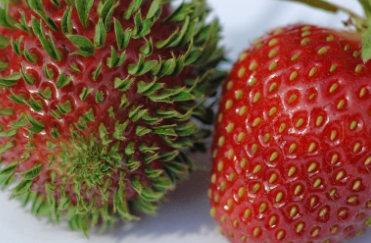 O morango na realidade é um pseudocarpo, ou seja, um pseudofruto ou um falso fruto, uma vez que o morango é o resultado do crescimento do tecido do receptáculo que contém os ovários da flor. Os reais frutos de um morango são as chamadas "sementes do morango", que são frutos do tipo aquênio (um tipo de fruto seco), e que contêm uma única semente cada um. Cada flor tem muitos ovários e cada um gera, quando fertilizado, um aquênio.